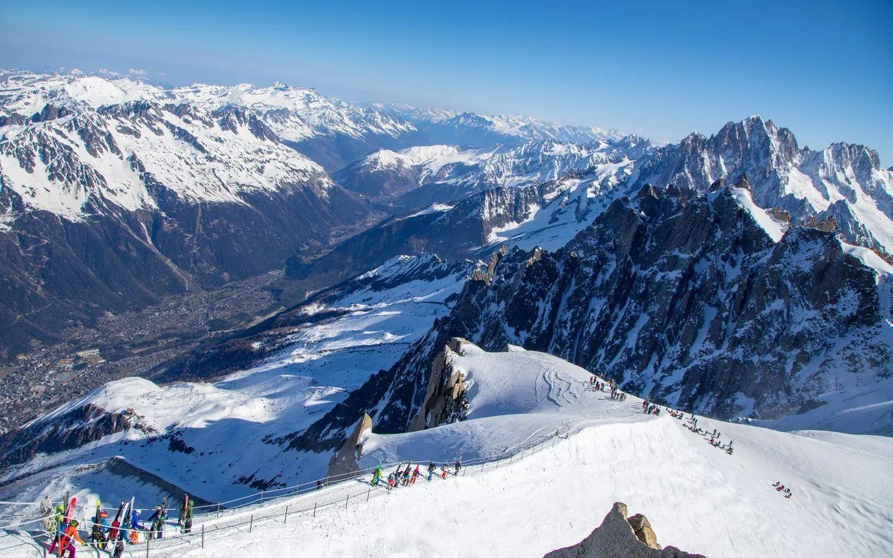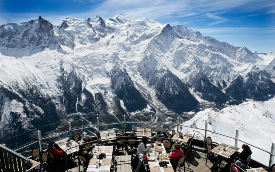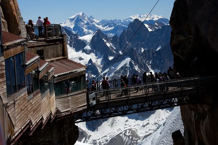 En af hovedattraktionerne i Chamonix Mont-Blanc er svævebanen Aiguille du Midi, som løfter besøgende op i 3.842 meters højde. Herfra åbner der sig et betagende panorama over Mont Blanc og Alpernes tinder i Frankrig, Italien og Schweiz. Her ligger den berømte udsigtsplatform “Step into the Void” — en glasplatform over afgrunden, som giver en følelse af at svæve over bjergene.