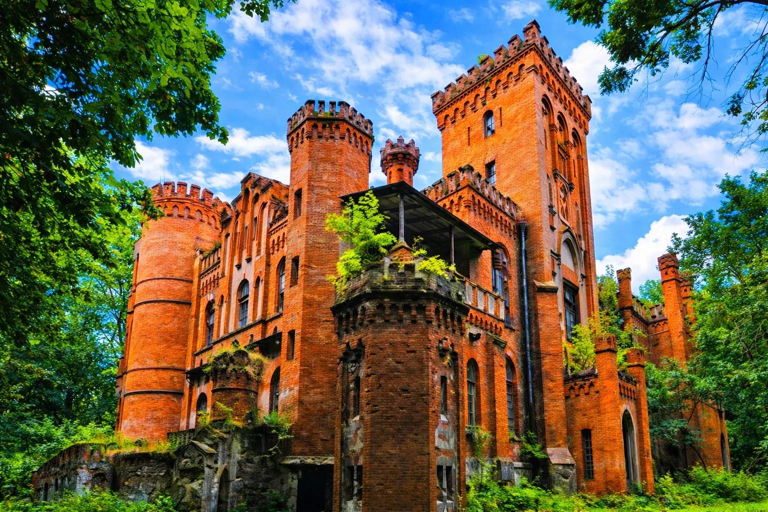The first thing that impresses you is the scale. Towers, brick façades, an asymmetrical composition — all of it creates the image of a real family castle. The best time for viewing is morning or evening light, when shadows highlight the details.