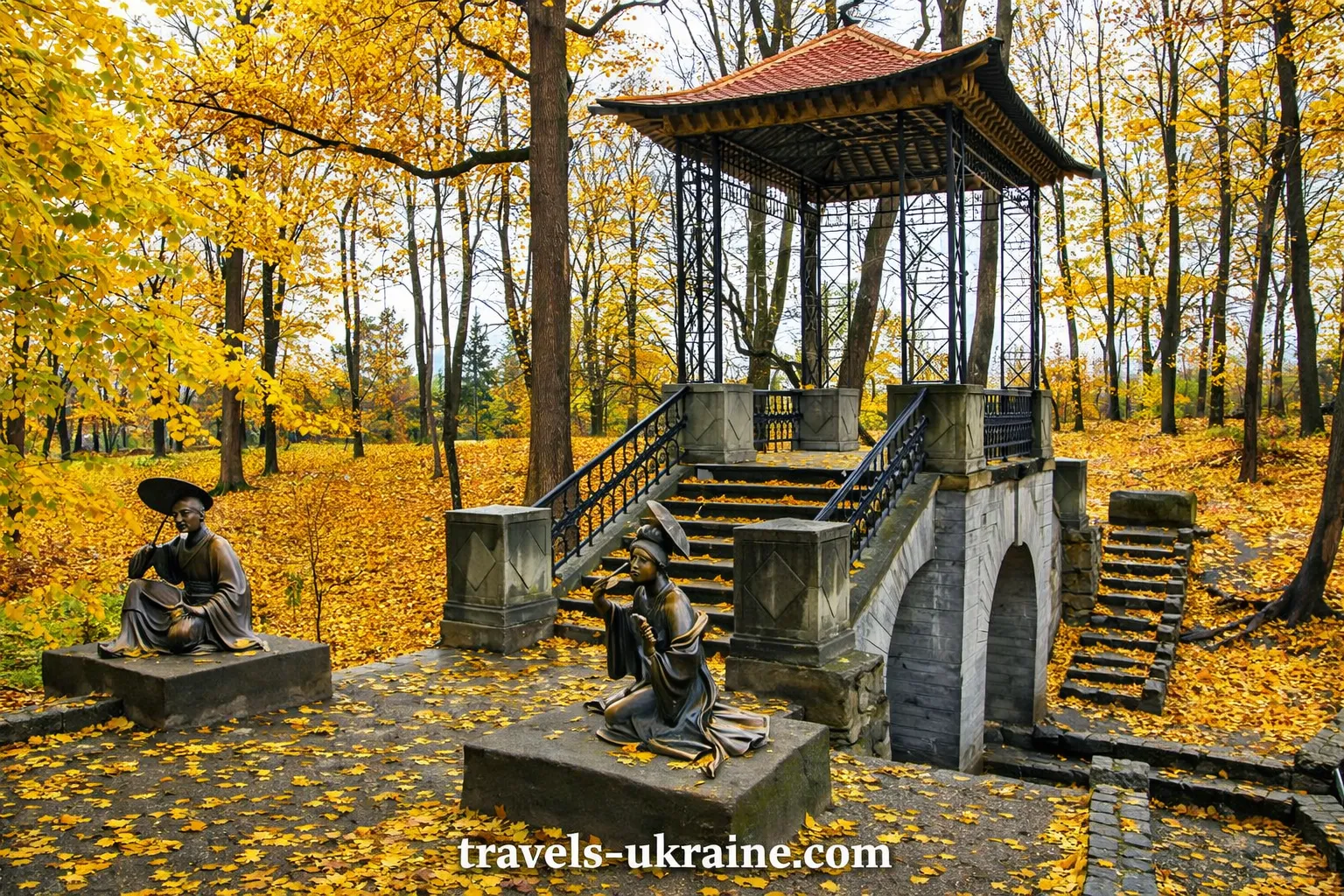 Далі у списку — витончений Китайський місток, що додає пейзажу легкого східного акценту. Поруч — ставки та водні плеса, які віддзеркалюють небо й крони дерев. Це одна з найпопулярніших зон для прогулянок на природі та сімейного відпочинку. А ще — улюблене місце для фотозон і пам’ятних світлин гостей.